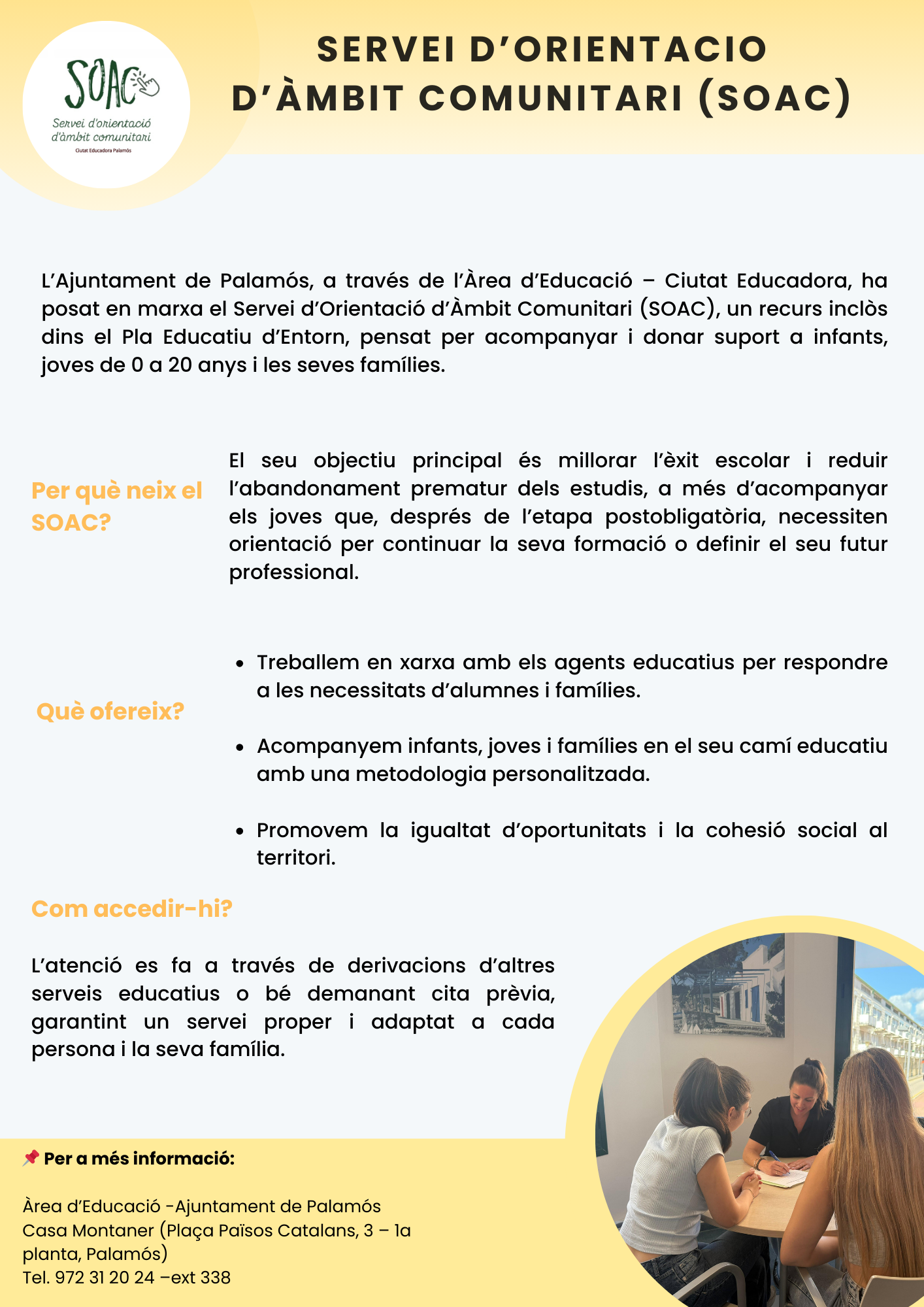 El Servei d’Orientació d’Àmbit Comunitari (SOAC). Un servei que en coordinació amb l’OME i els centres educatius té com a objectiu orientar i acompanyar l’alumnat i les famílies en el procés de construcció de trajectòries personals d’èxit educatiu, acadèmic, personal i social. Trobareu més informació a la pestanya lateral.